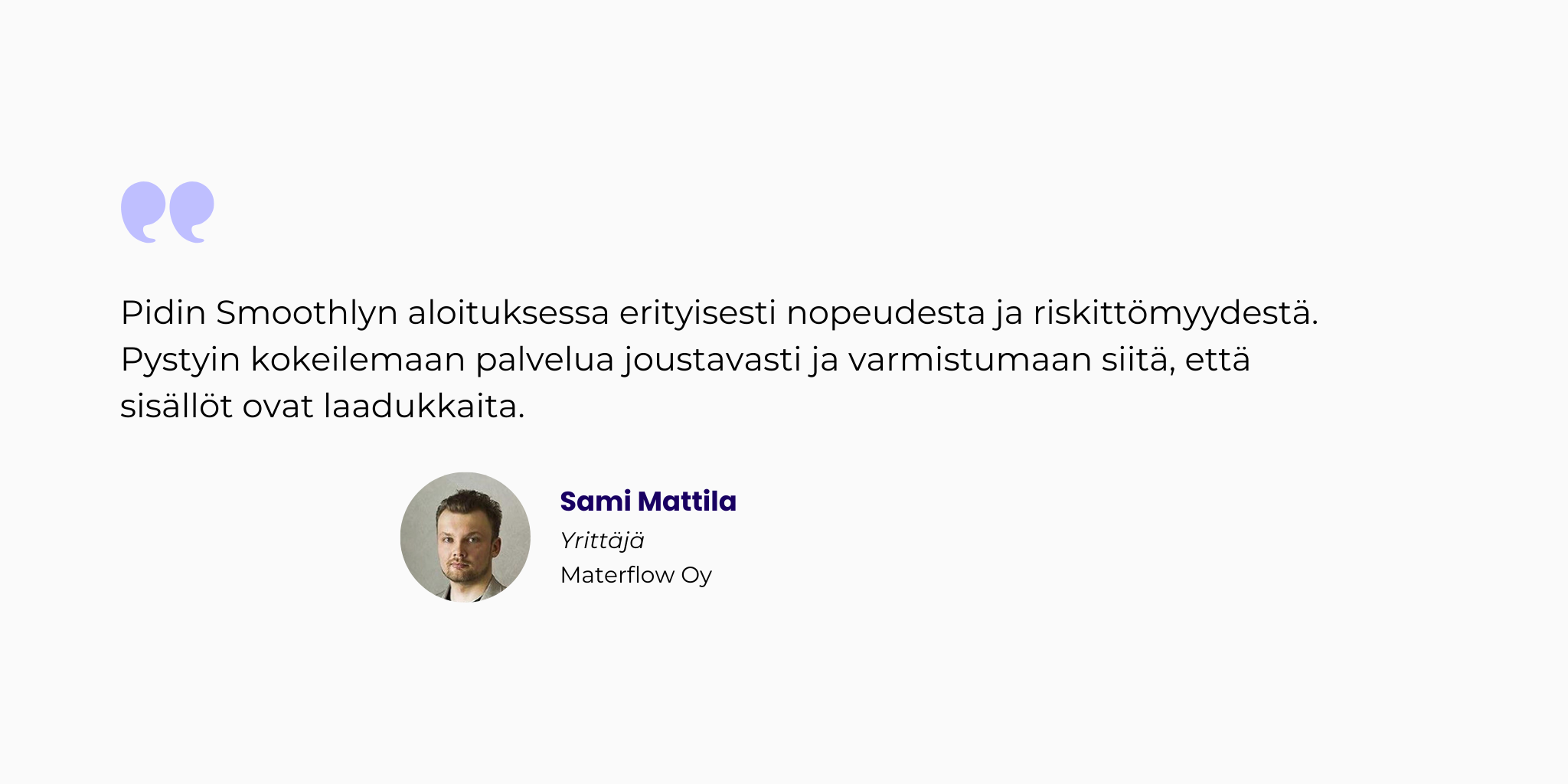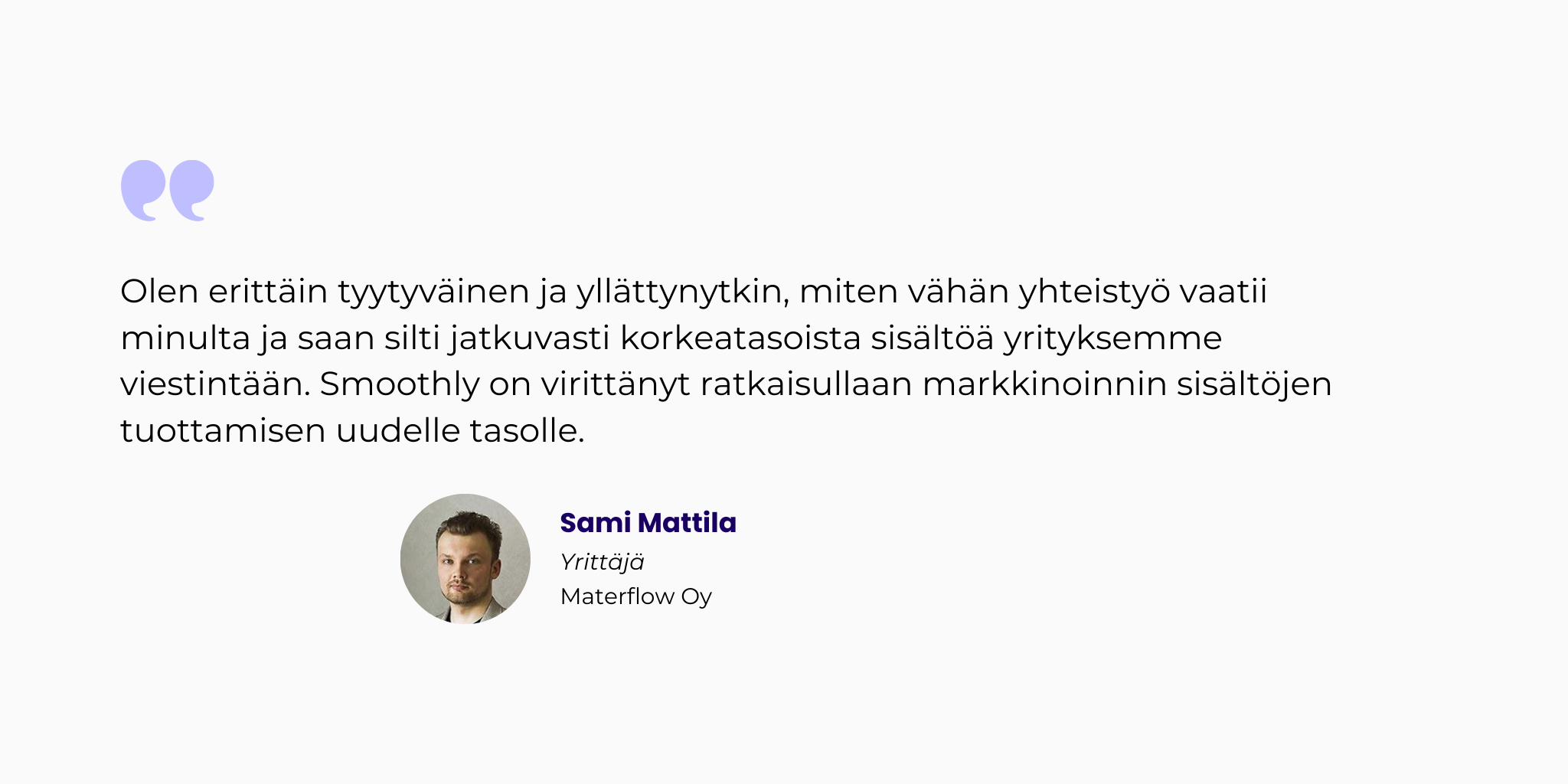 -Olen erittäin tyytyväinen ja yllättynytkin, miten vähän yhteistyö vaatii minulta ja saan silti jatkuvasti korkeatasoista sisältöä yrityksemme viestintään. Smoothly on virittänyt ratkaisullaan markkinoinnin sisältöjen tuottamisen uudelle tasolle.